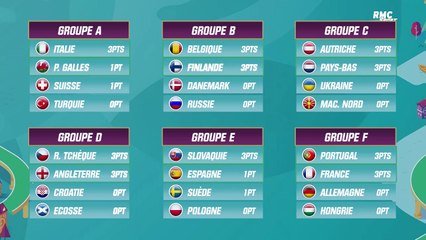 Retrouvez les huit groupes de l'euro 2020 de football, toutes les équipes, les résultats et les classements.
